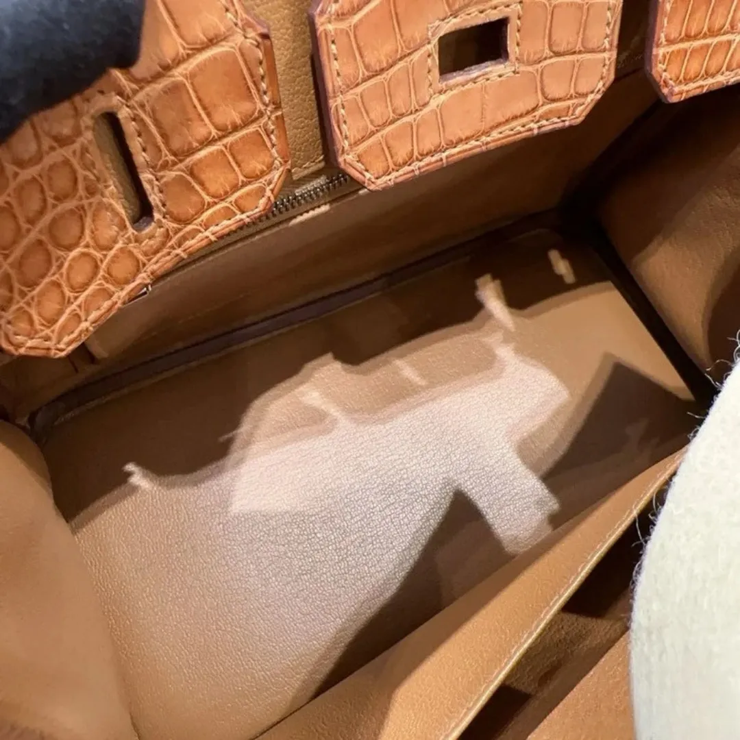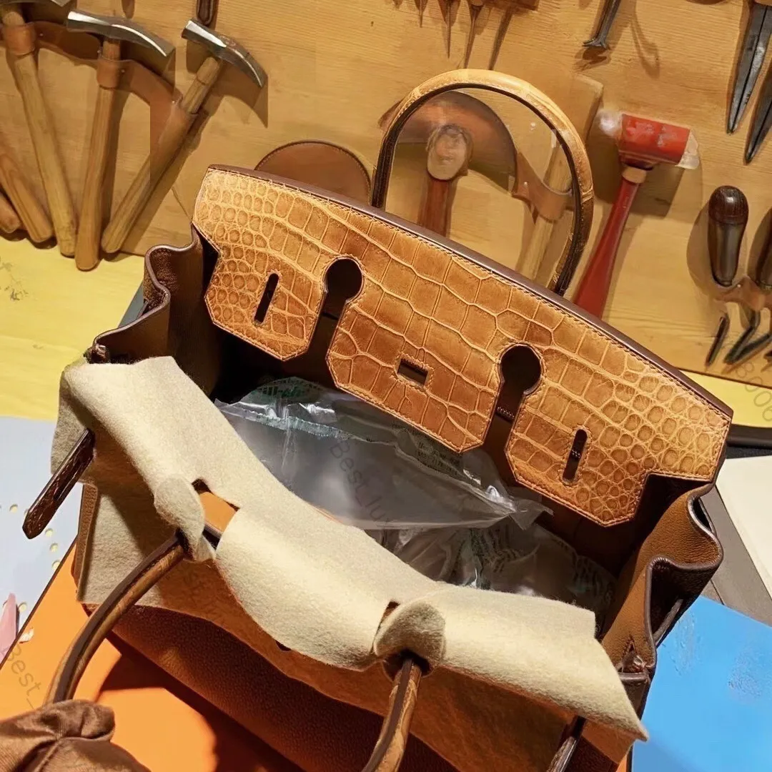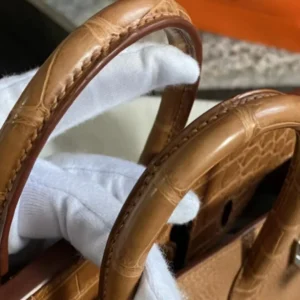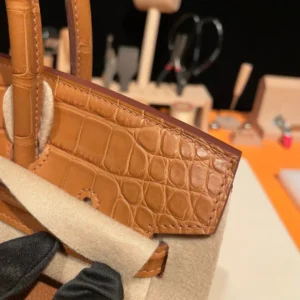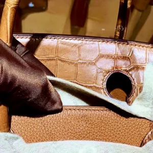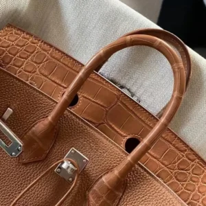 Crafted for those who demand sophistication and bold luxury, this fully handmade designer handbag blends two premium leathers — genuine French alligator and Togo leather — in a stunning bi-texture design. Available in 25cm and 30cm, it features a structured silhouette ideal for business, commuting, or upscale events. Finished with 24K real gold-plated hardware, every detail of this bag speaks of precision, exclusivity, and timeless style. The touch of alligator adds luxury, while the Togo leather ensures durability and softness in everyday use.